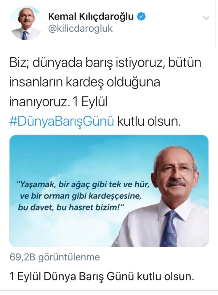 #DünyaBarışGünü Bugün 1 Eylül. #DünyaBarışGünü kutlu olsun. https://twitter.com/kilicdarogluk/status/1168042856176467971?s=21 Bunu paylaş: X'te paylaşmak için tıklayın (Yeni pencerede açılır) X Facebook'ta paylaşmak için tıklayın (Yeni pencerede açılır) Facebook Beğen Yükleniyor... İlgili Yorum bırakın Cevabı iptal et Δ