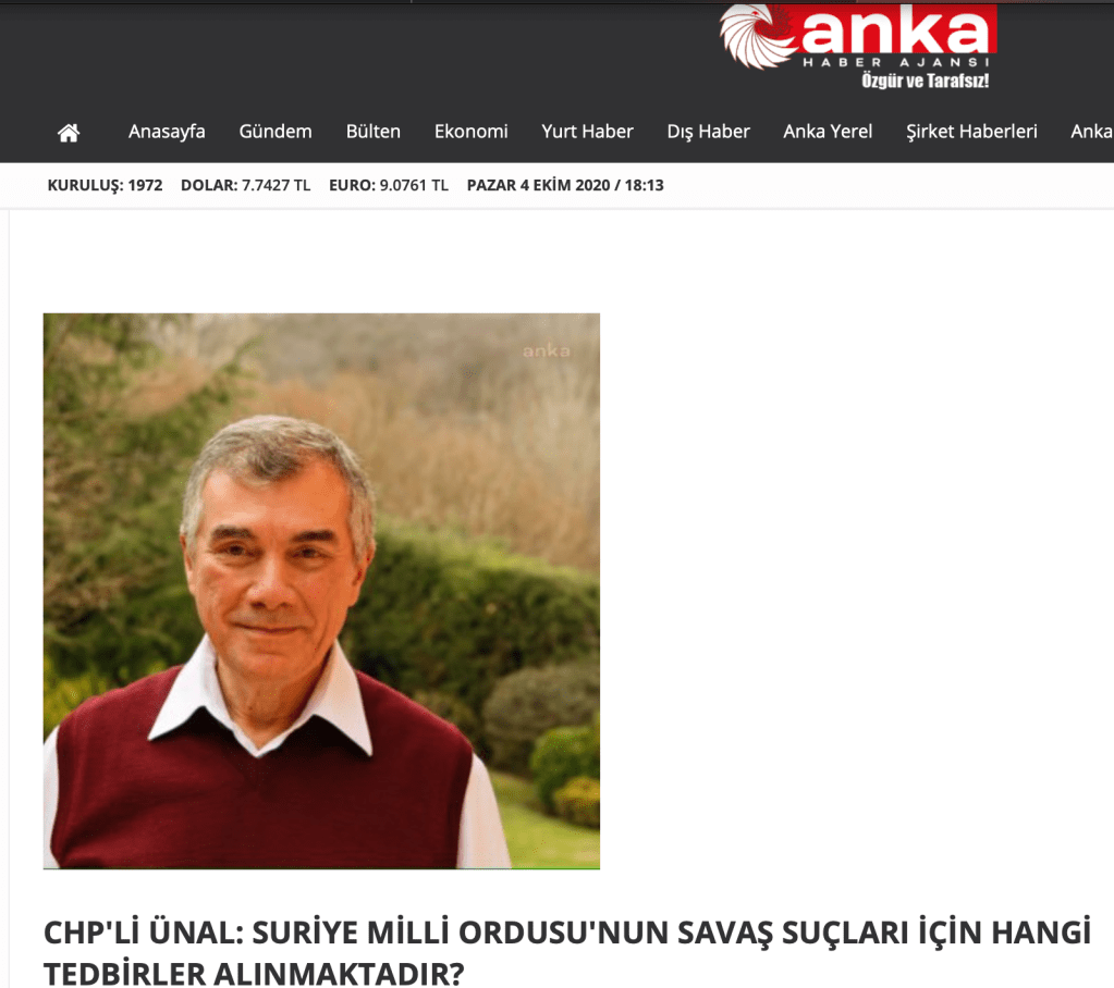 CHP İstanbul Miletvekili ve Dış İlişkilerden Sorumlu Genel Başkan Başdanışmanı Ünal Çeviköz, “Türkiye destekli Suriye Milli Ordusunun eylemlerini” Meclis gündemine taşıdı. Çeviköz, Suriye Milli Ordusu’nun ‘esir alma, kötü muamele, işkence ve tecavüz’ gibi savaş suçları işlemiş olabileceğinin ifade edildiğini” belirterek, “Suriye Milli Ordusu’nun söz konusu eylemleri hakkında hangi tedbirler alınmaktadır? diye sordu.