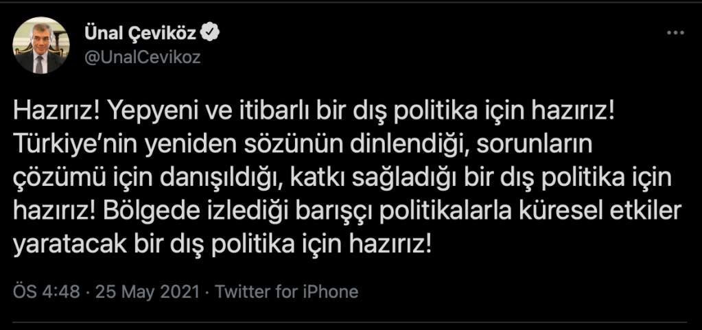 Hazırız! Yepyeni ve itibarlı bir dış politika için hazırız! Türkiye’nin yeniden sözünün dinlendiği, sorunların çözümü için danışıldığı, katkı sağladığı bir dış politika için hazırız! Bölgede izlediği barışçı politikalarla küresel etkiler yaratacak bir dış politika için hazırız!