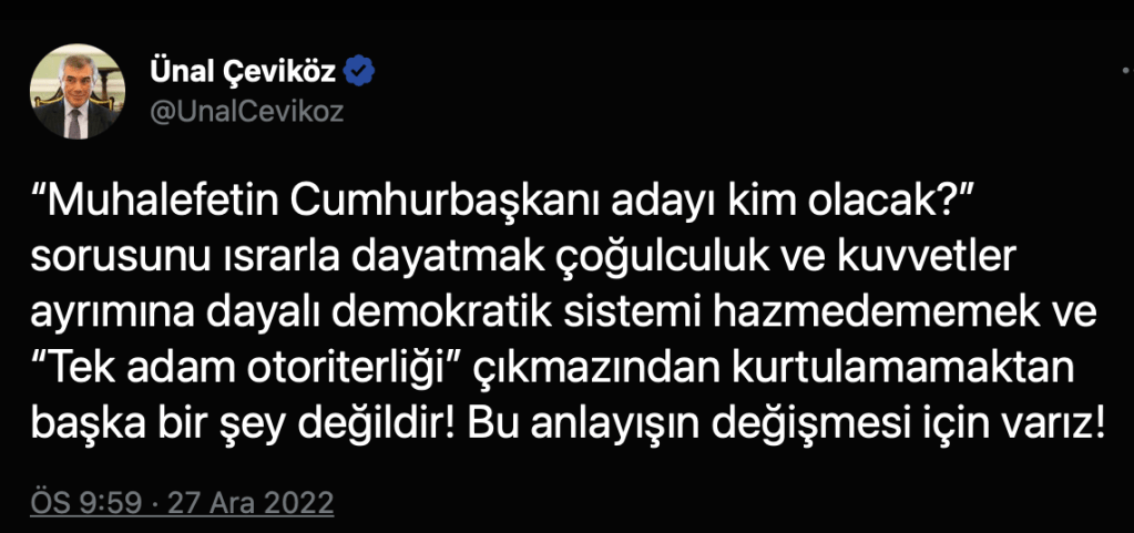 “Muhalefetin Cumhurbaşkanı adayı kim olacak?” sorusunu ısrarla dayatmak çoğulculuk ve kuvvetler ayrımına dayalı demokratik sistemi hazmedememek ve “Tek adam otoriterliği” çıkmazından kurtulamamaktan başka bir şey değildir! Bu anlayışın değişmesi için varız!